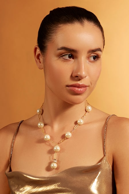 old finish lariat necklace accentuated with pearl detailing.